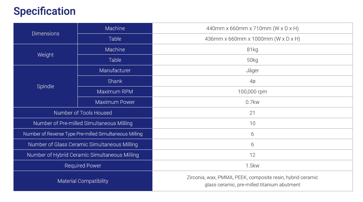 نوع مواد قابل برش Zirconia,wax,PMMA,PEEK,composite resin,hybrid ceramic,Glass ceramic,pre-milled titanium abutment برند اسپیندل jager سرعت اسپیندل 100.000 دور در دقیقه قدرت اسپیندل 0.7 kw چرخش محور اصلی A:+/-۳۶۰° و B:+/-۳۰° ابعاد 440*660*710mm وزن 75 Kg